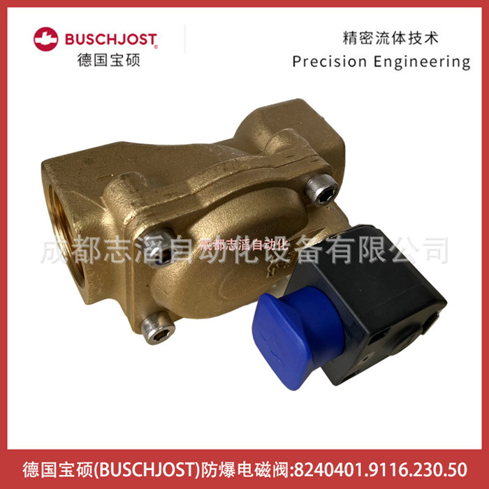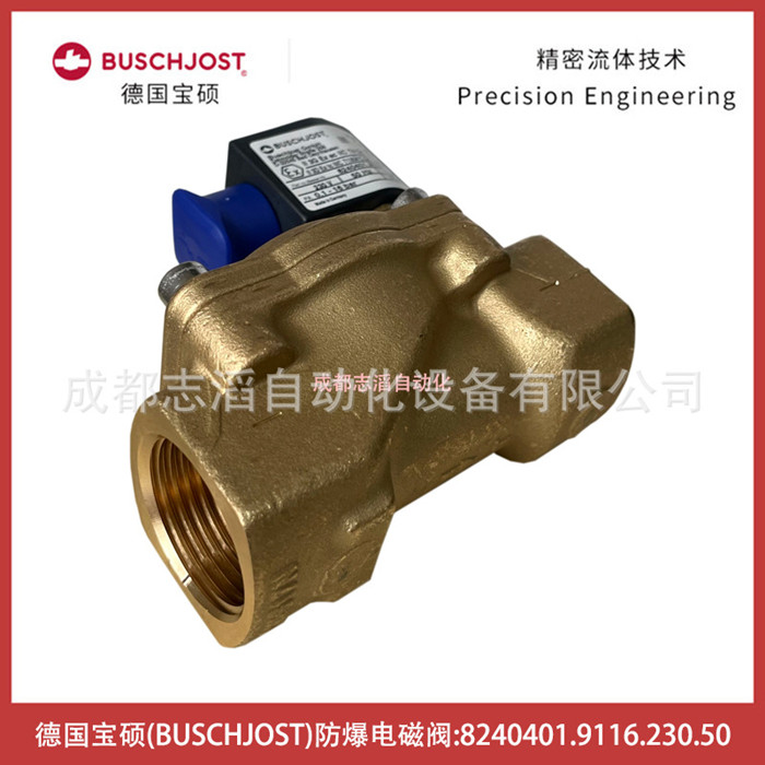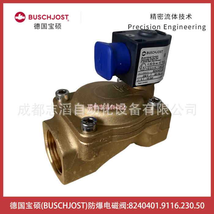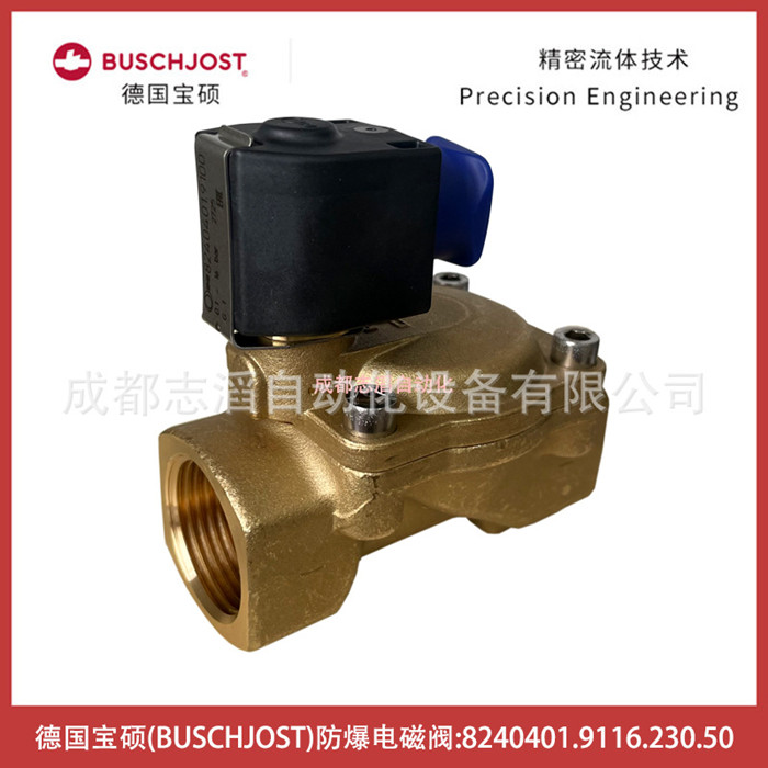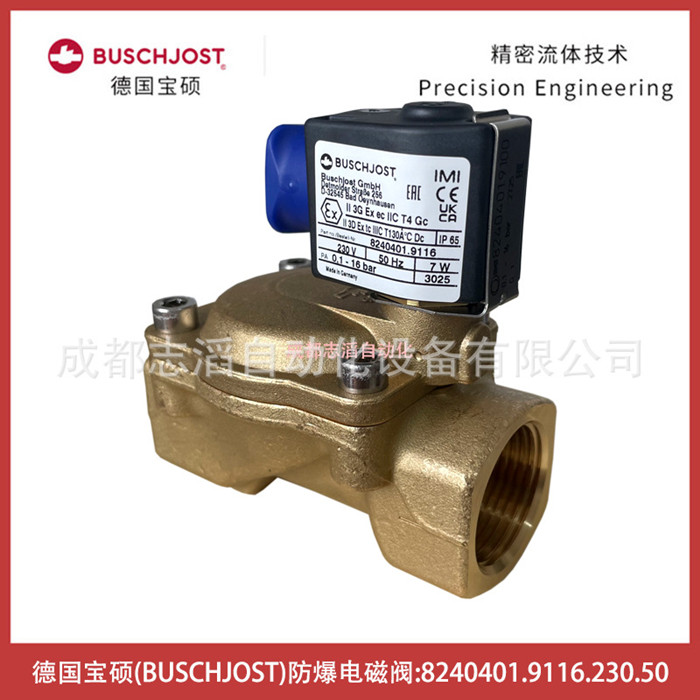 8240401.9116.230.50德國寶碩BUSCHJOST防爆電磁閥-氣動控制元件技術參數簡介:流通通徑25mm、接口尺寸G1、工作壓力0.1-16bar、KV值9.5立方米/h、閥體重量0.95kg、配寶碩防爆線圈9116、線圈電壓為AC220V交流、電氣連接為DIN43650!線圈功耗7瓦、線圈重量為0.15kg防護等級IP65、環境溫度為-25到50攝氏度、產地為德國,應用在水處理設備!