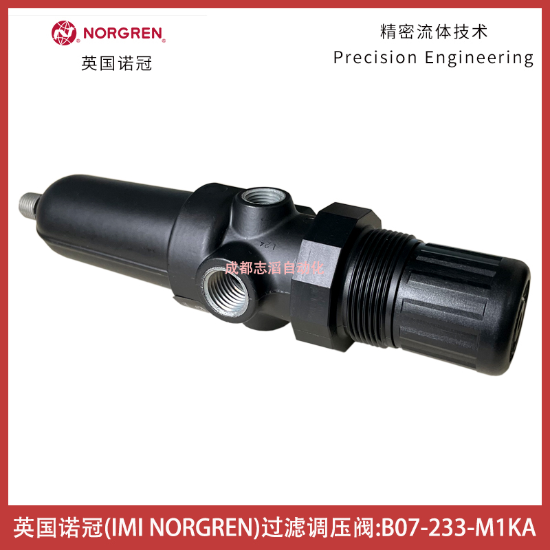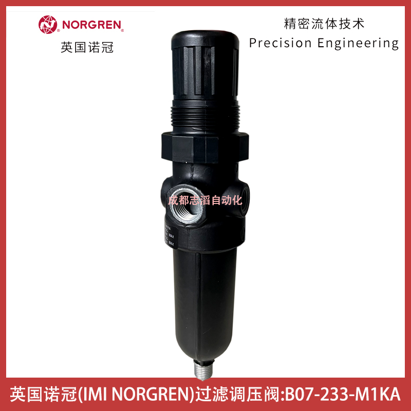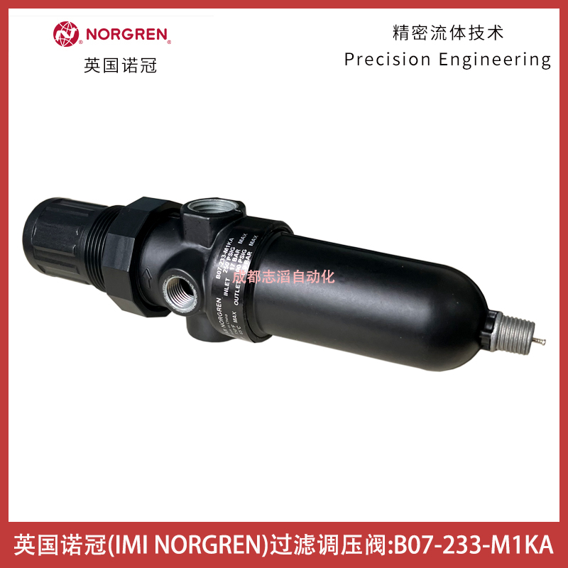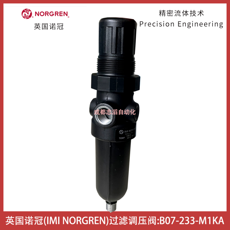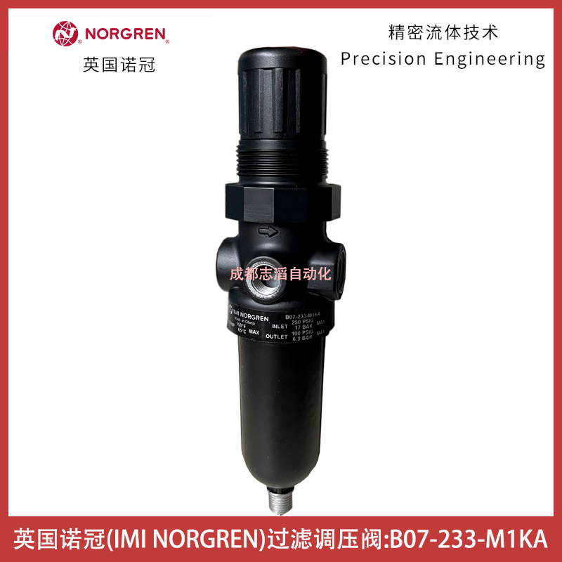 英國諾冠(IMI NORGREN)微型/管接式過濾調壓閥B07系列技術優勢:通用型過濾調壓閥適用、高性能設計、在壓降小的情況下的高流量、旋鈕有快速鎖定裝置、透明杯360°可見度、金屬杯耐高壓、標準型包括非溢流型,金屬杯和可選壓力范圍