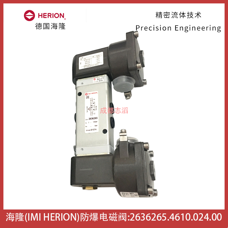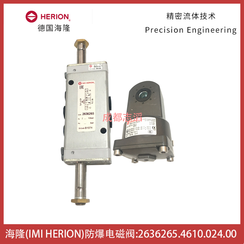 2636265.4610.024.00德國海隆(IMI HERION)管式隔爆電磁閥技術參數:接口尺寸G1/4、工作壓力1-10bar、流量1200l/min、響應時間30ms、閥體重量0.9kg、功能2位5通、手動應急控制按下并鎖定、驅動方式電控/電控、產地德國、線圈4610(功耗3.9W、額定電流162MA、防護等級IP66帶電氣接頭、防爆ATEX類別II2 G Ex D mb IIC T4/T6 Gb,II2 G Ex e mb IIC T4/T6 Gb , II2 D Ex tb IIIC T13攝氏度Db、環境及流體溫度T4(-40到80攝氏度)T6(-40到55攝氏度),-40到80攝氏度、電氣接口1/2NPT、線圈重量0.8kg、產地為捷克!)
