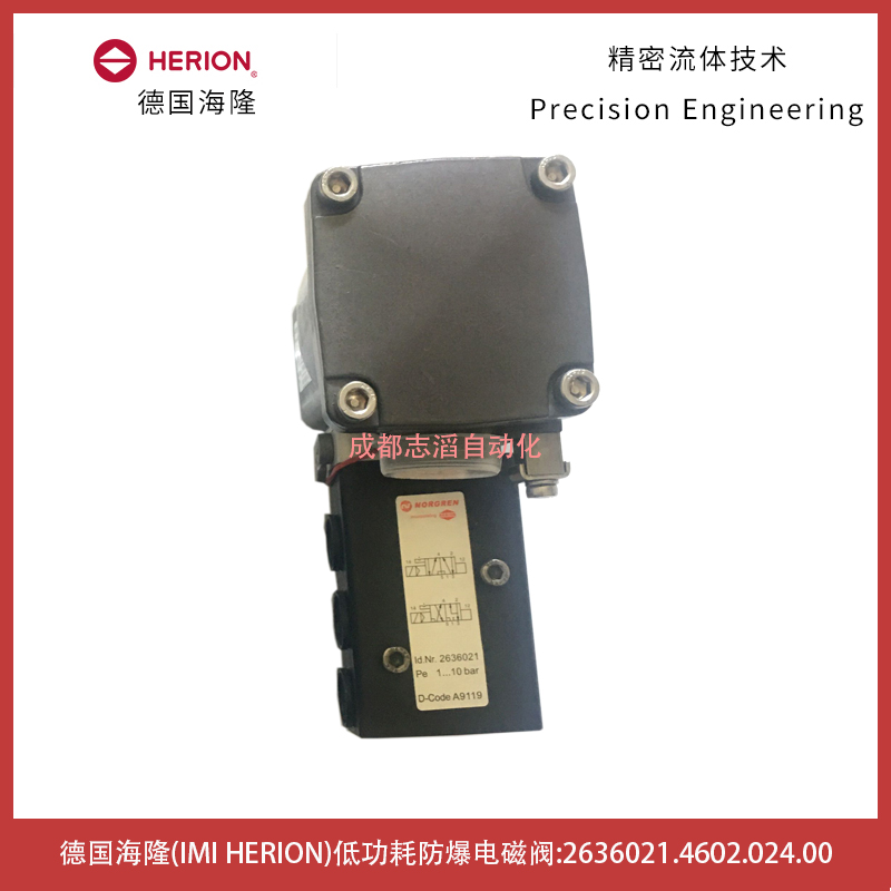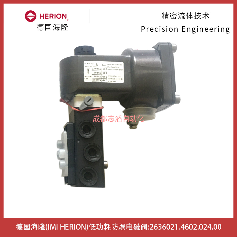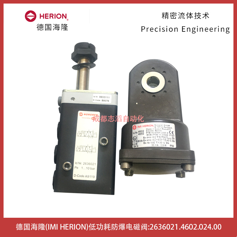 2636021.4602.024.00德國海隆(HERION)防爆電磁閥技術參數:接口尺寸1,2為G1/4、3,4為法蘭、工作壓力氣動1bar、工作耐壓10bar、流量為1200l/min、切換時間為35ms、帶手動應急控制、閥體重量0.55kg、電磁閥先導型號為9933111、配海隆隔爆線圈4602(功耗為0.8W、額定電流為33mA、EX-防護類別為II2G,II2D、防護等級為Ex d mb IICT5/T6 IP66 T130°、環境及流體溫度范圍-40到80攝氏度T5,-40到70攝氏度T6,-40到80攝氏度、電氣接口為M20X1.5、線圈重量為0.8kg、產地為捷克)