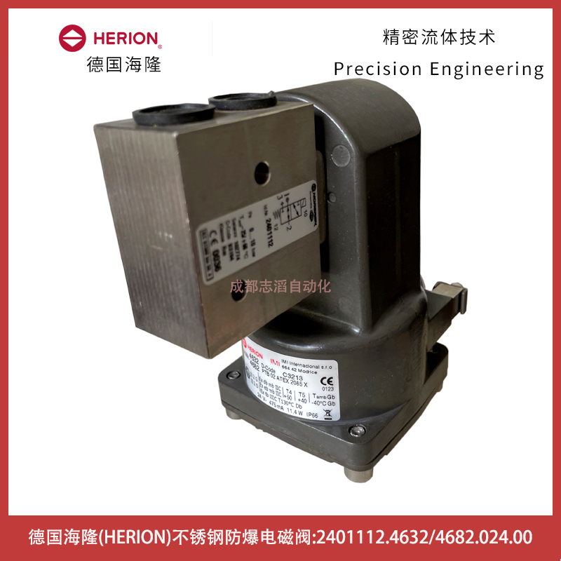 2401112.4632/4682.024.00德國海隆HERION不銹鋼防爆電磁閥-埃邁諾冠NORGREN技術參數簡介:接口尺寸1/4NPT、工作壓力0-10bar、閥座密封件材料NBR、配4632/4682.024.00(線圈功耗11.4瓦、電流475毫安、防護等級EEX MDIICT4/T5、類別II2G(氣體)-40到正60攝氏度(T4),負40到正40攝氏度(T5)、線圈重量0.8千克、套管直徑16毫米、產地捷克)的防爆線圈!成都