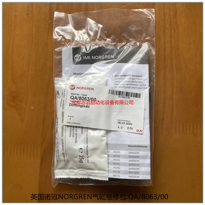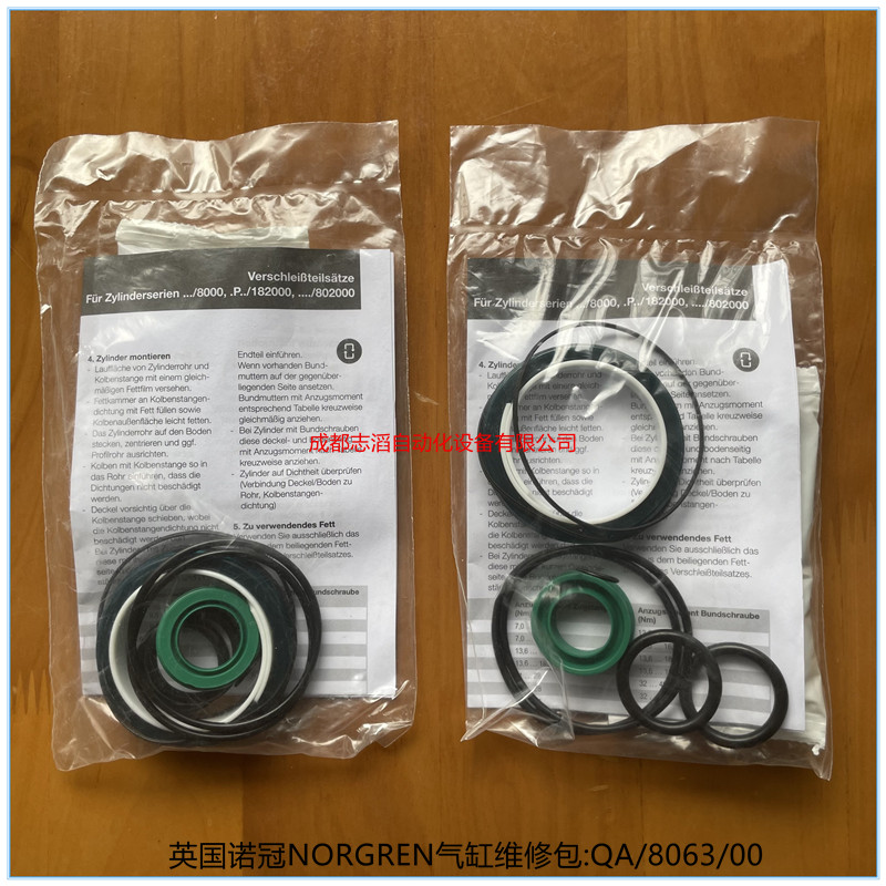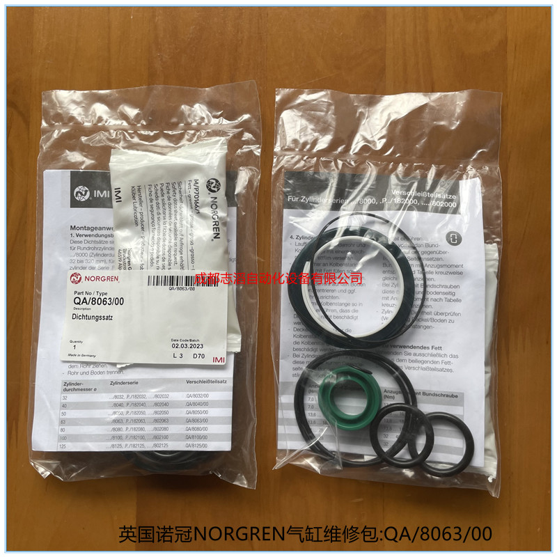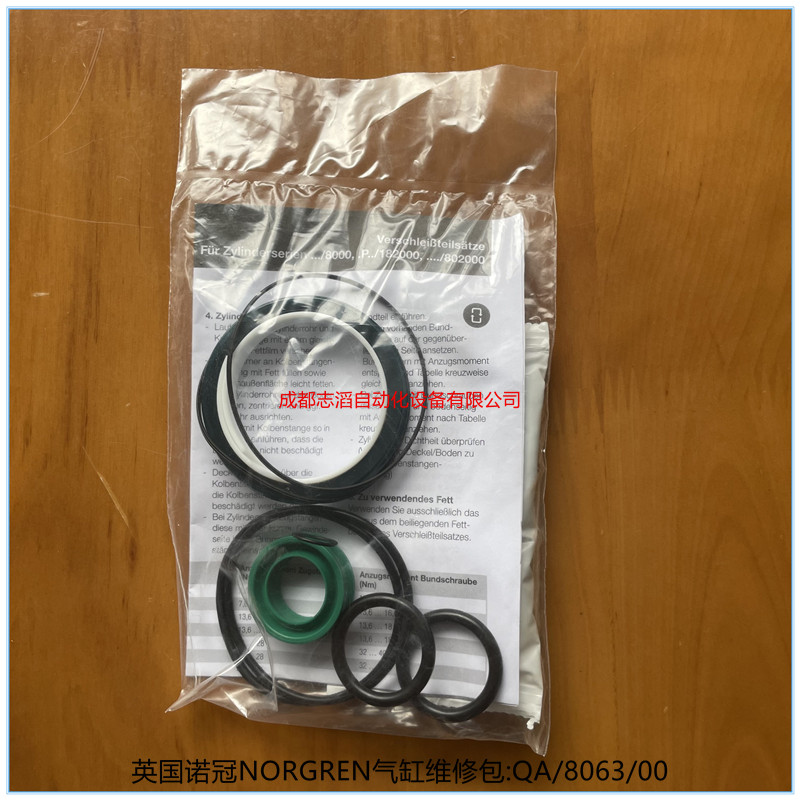 QA/8063/00英國諾冠NORGREN氣缸維修包-埃邁海隆HERION:適用于諾冠(norgren)氣缸一下系列缸徑為100mm的、產地為德國、包含潤滑油、密封包!(ISO/VDMA型材氣缸PRA/181000,..../M,PRA/183000,....、/M系列單作用,雙作用式PRA/1820000系列、ISO/VDMA氣缸RA/8000/M系列!)