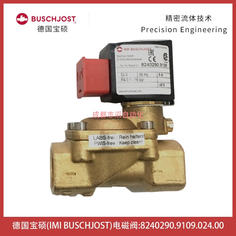 8240290.9109.024.00德國寶碩(IMI BUSCHJOST)隔膜閥技術參數:流通通徑12mm、接口尺寸G1/2、工作壓力0.1-16bar、Kv值為3.8立方米/小時、閥體重量為0.5kg、配寶碩普通線圈9109(線圈電壓為24V直流、線圈功率為8W、防護等級IP65、環境溫度-25到50攝氏度、流通溫度可達110攝氏度)、產地為德國、應用在汽車自動化生產線流通控制!