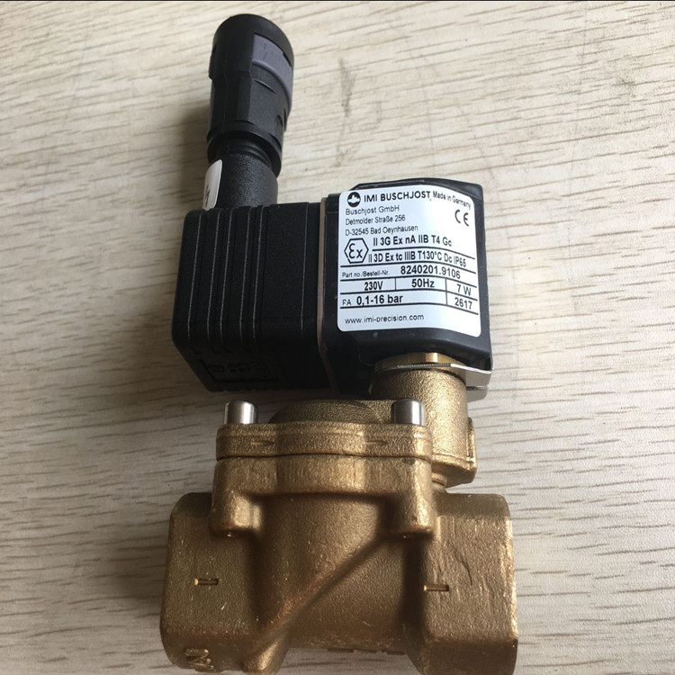 8240201.9106.230.50德國寶碩(IMI BUSCHJOST)電磁閥技術參數:流通通徑12mm、接口尺寸G1/2、工作壓力0.1-16bar、kv值3.8立方米/h、閥體重量0.5kg、配寶碩普通線圈9106-線圈電壓為AC2300V、應用在化工行業