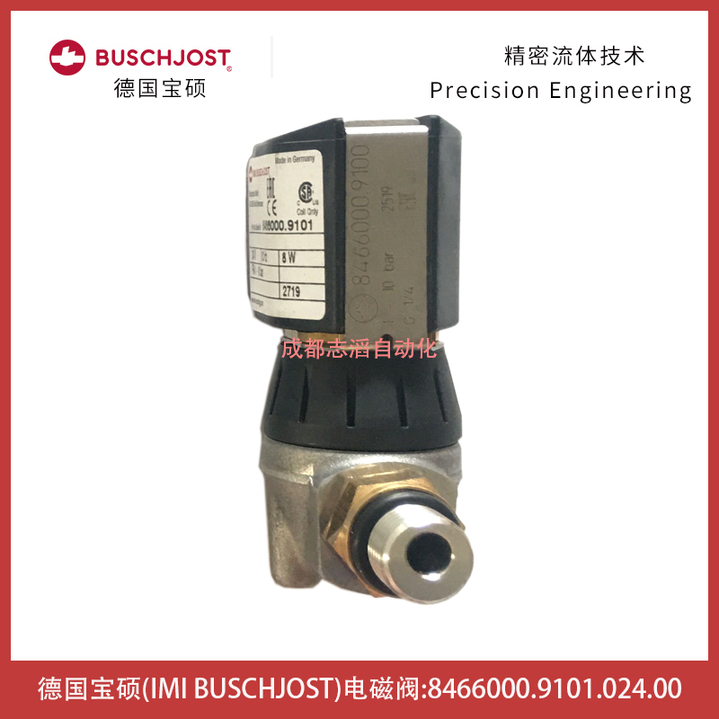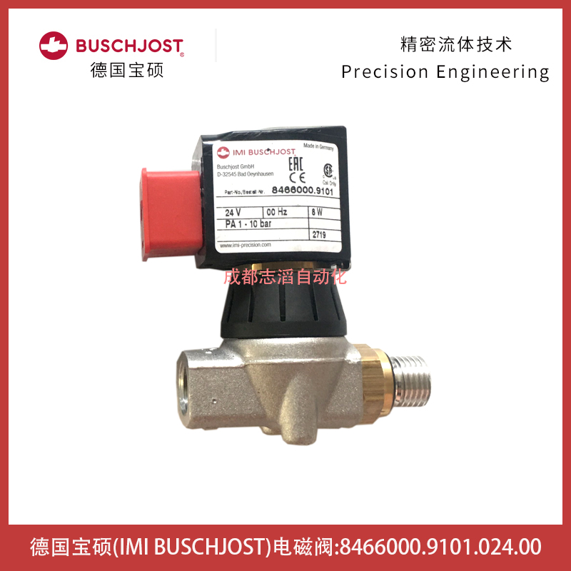 8466000.9101.024.00德國寶碩(buschjost)電磁閥技術(shù)參數(shù)簡介:接口尺寸G1/4、工作壓力1-10bar、相應(yīng)時間8.5ms、關(guān)時間30.4ms、閥體重量0.47kg、流量1.2l/min、配寶碩普通線圈9101(線圈功率為8W、防護(hù)等級IP65、流體溫度可達(dá)110攝氏度、環(huán)境溫度范圍-25到50攝氏度、電氣連接DIN43650A型、線圈重量0.15kg)、線圈電壓為DC24V!