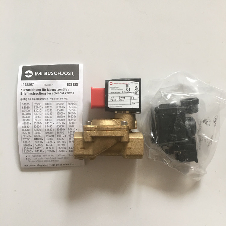 8240200.9101.024.00德國寶碩IMI BUSCHJOST黃銅電磁閥技術(shù)參數(shù):流通通徑12mm、接口尺寸G1/2、工作壓力0.1-16bar、Kv值3.8立方米每時、閥體重量0.5kg、配寶碩普通線圈9101、線圈電壓為24V直流、產(chǎn)地為德國!