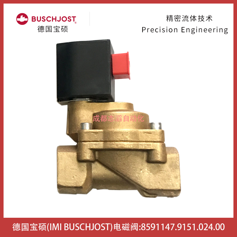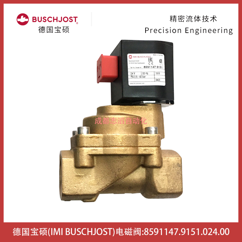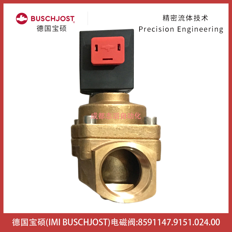 8591147.9151.024.00德國 寶碩(IMI BUSCHJOST)電磁閥技術參數簡介:閥體型號為8591147,閥體材料為黃銅、工作壓力范圍0.5-40bar、KV值為9.5立方米/H、流通通徑為25mm、捷克尺寸為G1、產地為德國;配寶碩線圈9151(線圈技術參數,功率損耗18W、電壓為24VDC-電流為750MA、防護等級為IP65、環境及流體溫度-流體可達110攝氏度,環境溫度范圍為-25到50攝氏度、電氣連接為DIN43650A型、線圈重量為0.4kg、產地為德國)