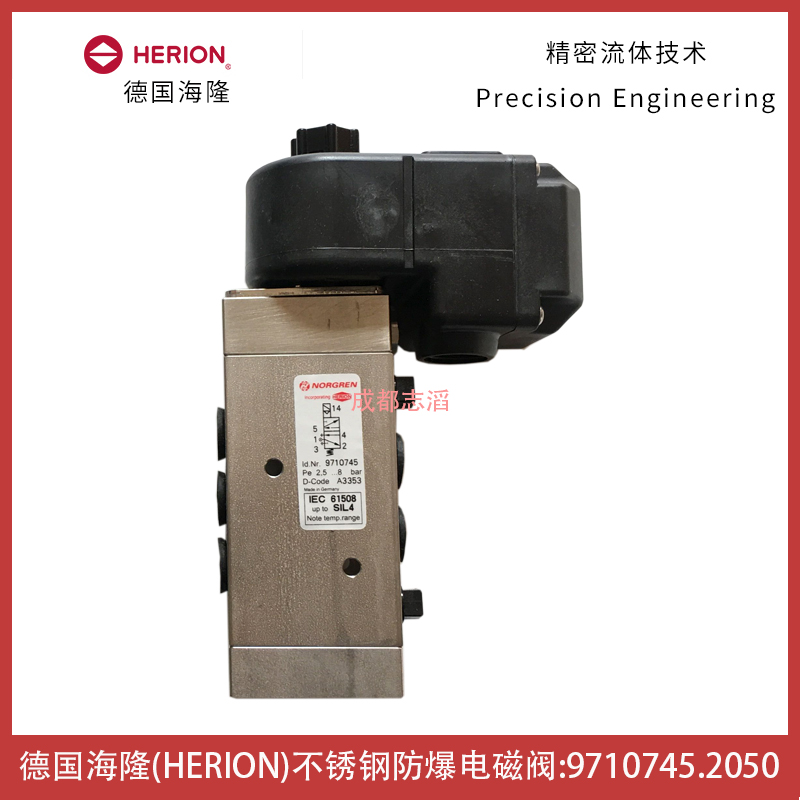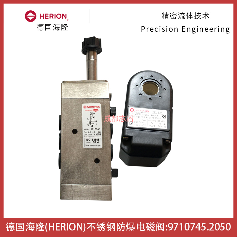 9710745.2050.000.00德國海隆(IMI HERION)不銹鋼電磁閥參數簡介:接口尺寸為1/4NPT、功能為5/2、工作方式電控/彈簧、Kv值為1.3立方米/h、閥體重量為1.8kg、產地為德國、配本安線圈2050.000.00(用于本安型電路的電磁線圈、防護等級EEx ia IICT5/T6,cat,II G,II2 D,IP66,T90,EC類檢測認證KEMA 0. ATEX 1051X;線圈參數簡介:線圈標稱阻值200歐姆、切換電流33mA、線圈阻值240歐姆、終端電壓RE60-8、溫度范圍-環境和流體T5為-40到80攝氏度,T6為-40到70攝氏度、線圈重量0.85kg、產地為德國)!應用在石化行業閥門控制