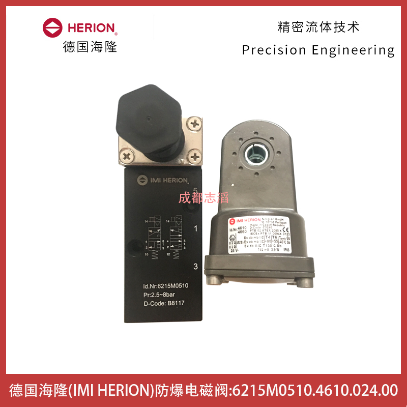 6215M0510.4610.024.00德國海隆(IMI HERION)隔爆電磁閥技術參數簡介:功耗為M中等功耗(3.9W)、功能為3/2和5/2NAMUR彈簧復位、閥體材料陽極氧化鋁/NBR(溫度范圍在-40到60攝氏度)通徑為6mm、流量為1200l/min、工作壓力范圍2.5-8bar、閥體重量為0.48kg、閥體產地為中國、接口尺寸為NPT1/4、手動控制為1/4圈旋轉手動控制、配海隆隔爆線圈4610(技術參數:功耗3.9W、額定電流162MA、防護等級IP66帶電氣接頭、防爆ATEX類別II2 G Ex D mb IIC T4/T6 Gb,II2 G Ex e mb IIC T4/T6 Gb , II2 D Ex tb IIIC T13攝氏度Db、環境及流體溫度T4(-40到80攝氏度)T6(-40到55攝氏度),-40到80攝氏度、電氣接口1/2NPT、線圈重量0.8kg、產地為接口)!應用在石化行業閥門控制