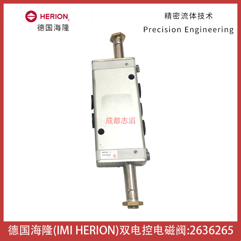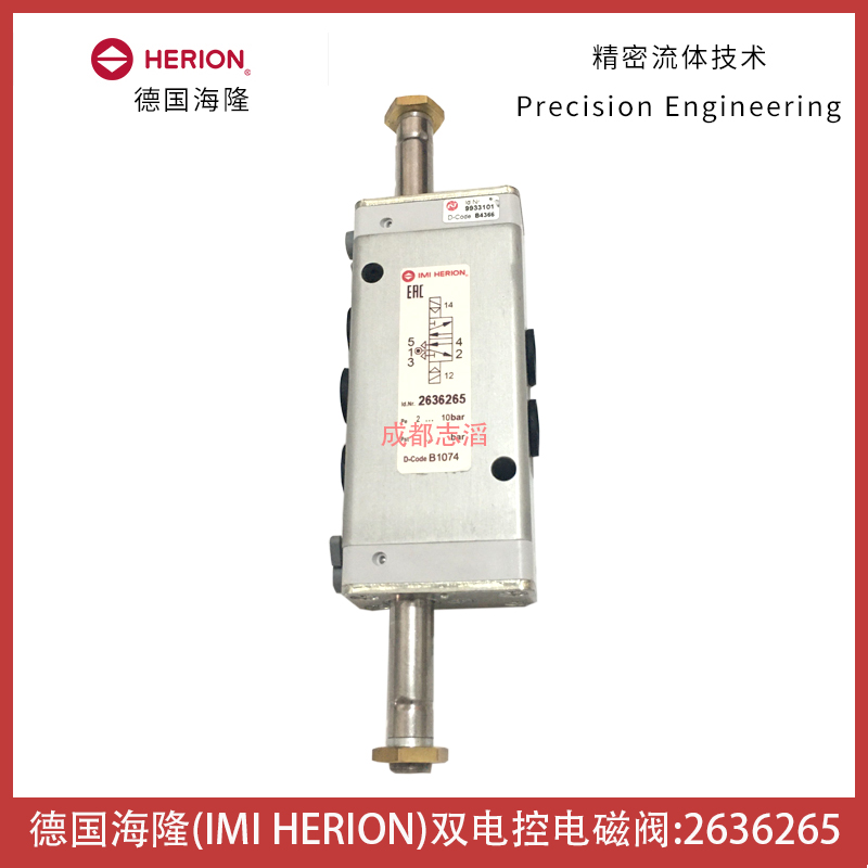 2636265德國海隆(IMI HERION)雙電控電磁閥技術參數:接口尺寸G1/4、工作壓力1-10bar、流量1200l/min、響應時間30ms、閥體重量0.9kg、手動應急控制按下并鎖定、功能2位5通、驅動方式電控/電控、產地德國