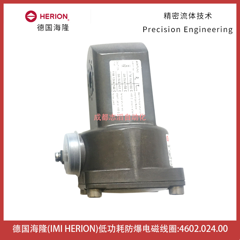 0000000.4602.024.00德國海隆(HERION)隔爆線圈技術參數簡介:功耗為0.8W、額定電流為33mA、EX-防護類別為II2G,II2D、防護等級為Ex d mb IICT5/T6 IP66 T130°、環境及流體溫度范圍-40到80攝氏度T5,-40到70攝氏度T6,-40到80攝氏度、電氣接口為M20X1.5、線圈重量為0.8kg、產地為捷克!