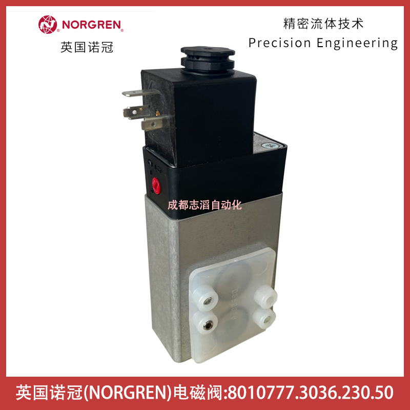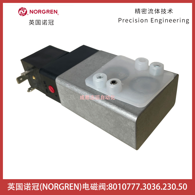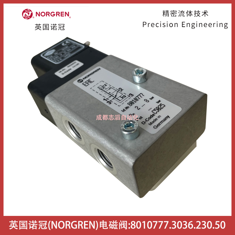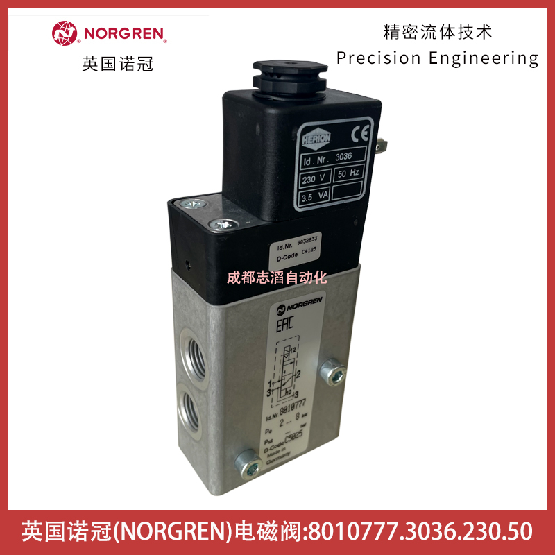 8010777.3036.230.50英國諾冠電磁閥NORGREN-IMI埃邁海隆HERION技術參數簡介:接口尺寸1、3、5為G1/4、2和4位法蘭、工作壓力2-8bar、功能2位3通、工作方式單電控、流通通徑6mm、KV值為1.2、閥體重量0.4kg、產地德國、配海隆HERION普通線圈3036(線圈功率3.5伏安).電壓為AC220V、防護等級IP65、電氣連接DIN43650A型、線圈重量0.09kg、產地為德國或者捷克!