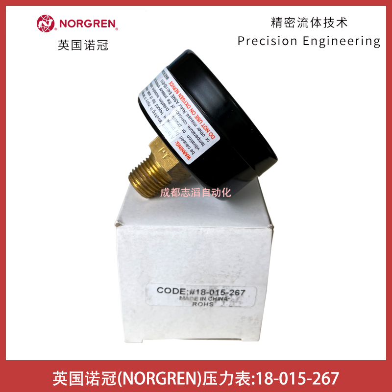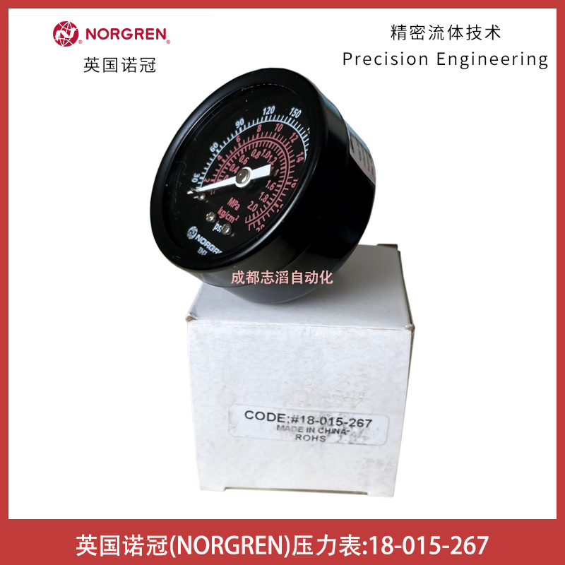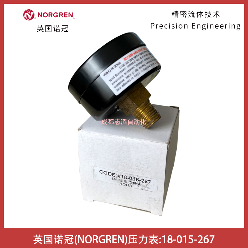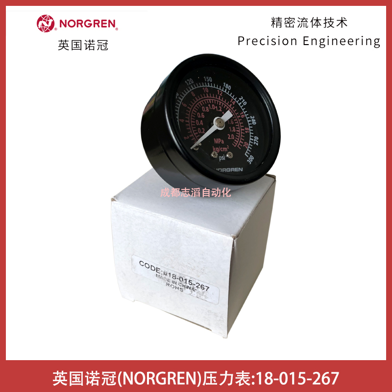 18-015-267英國諾冠壓力表NORGREN-IMI埃邁海隆氣動輔助元件技術參數簡介:壓力范圍0-20kg/cm2,0-2mpa,0-300psi、公稱直徑50mm、接口類型為背面中心、接口尺寸為R1/8、產地為中國!