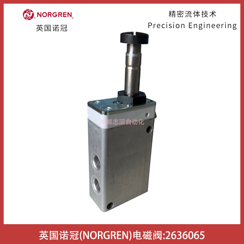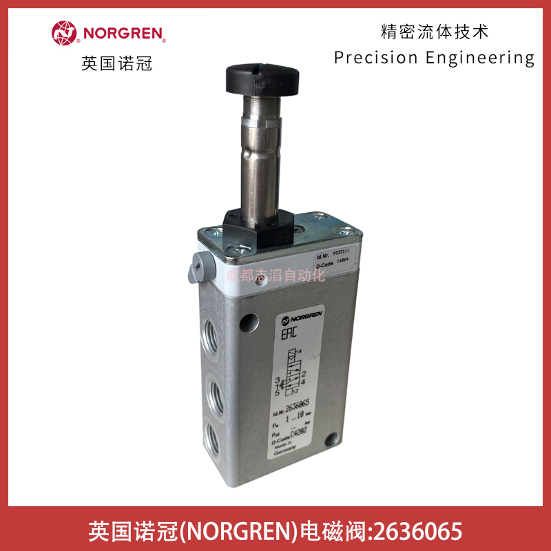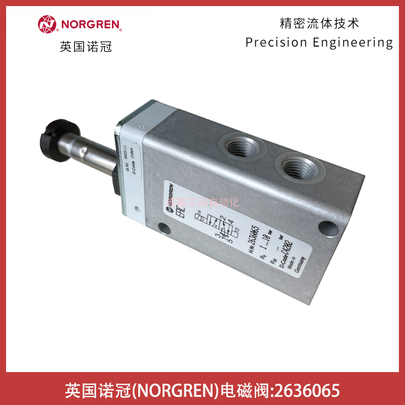 2636065英國諾冠NORGREN電磁閥-IMI埃邁海隆HERION技術參數簡介:功能2位5通、接口尺寸G1/4、工作壓力1-10bar、流量1200l/min、響應時間35ms、閥體重量0.55kg、手動應急控制按下并鎖定、產地為德國!