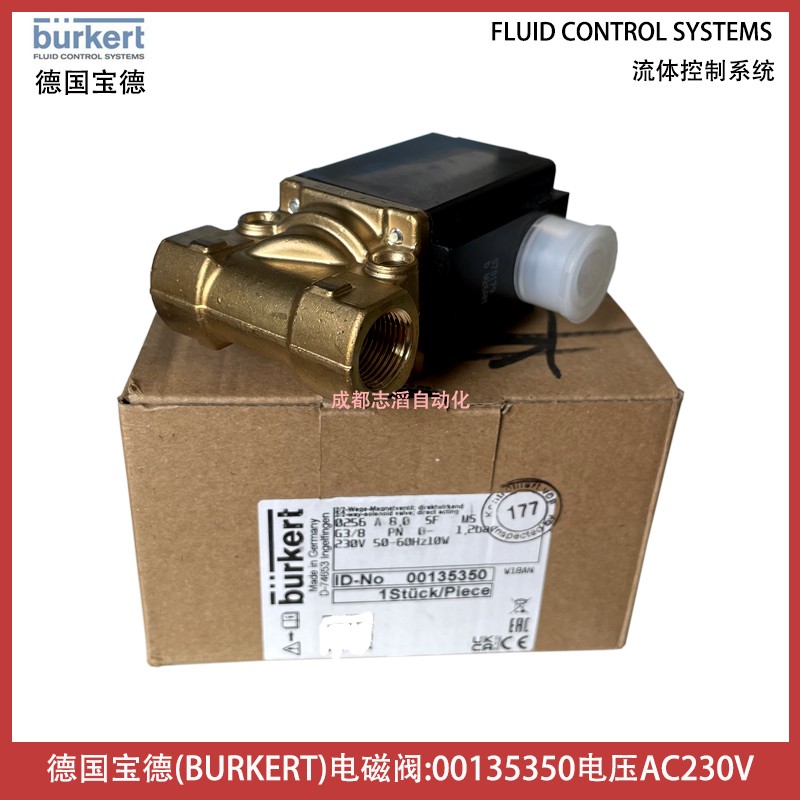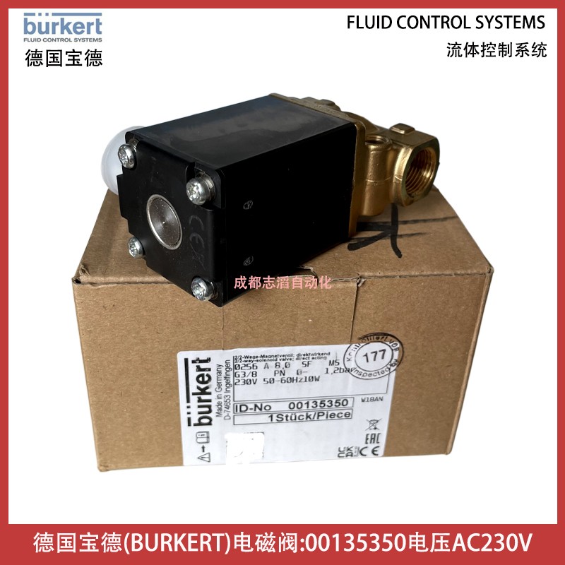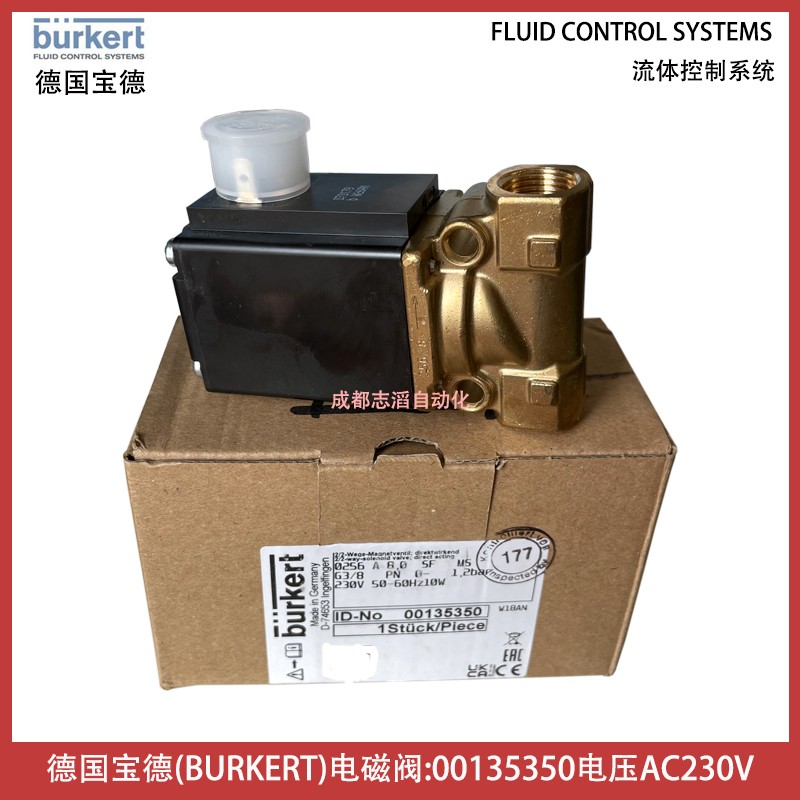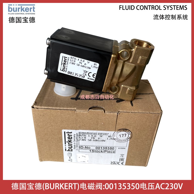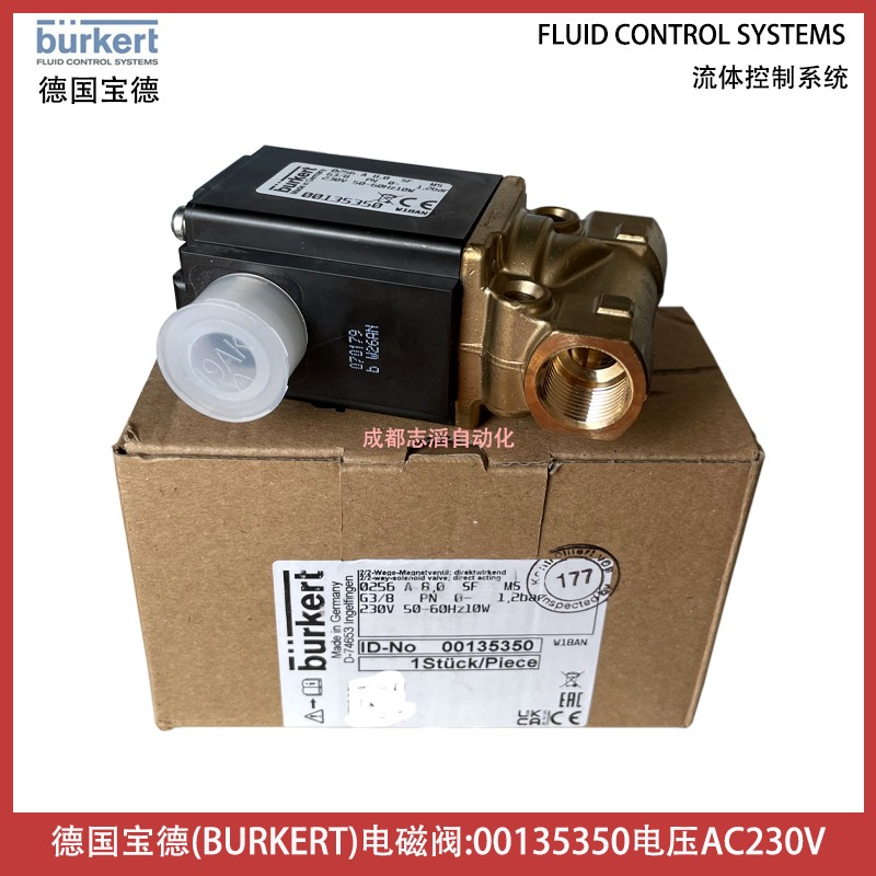 00135350德國寶德電磁閥BURKERT流體控制隔膜閥黃銅材質技術參數簡介:接管口徑3/8、產地德國、貨期6-8周、線圈電壓230伏交流、閥體材料黃銅、線圈供貨10瓦、PN0-1.2BAR、